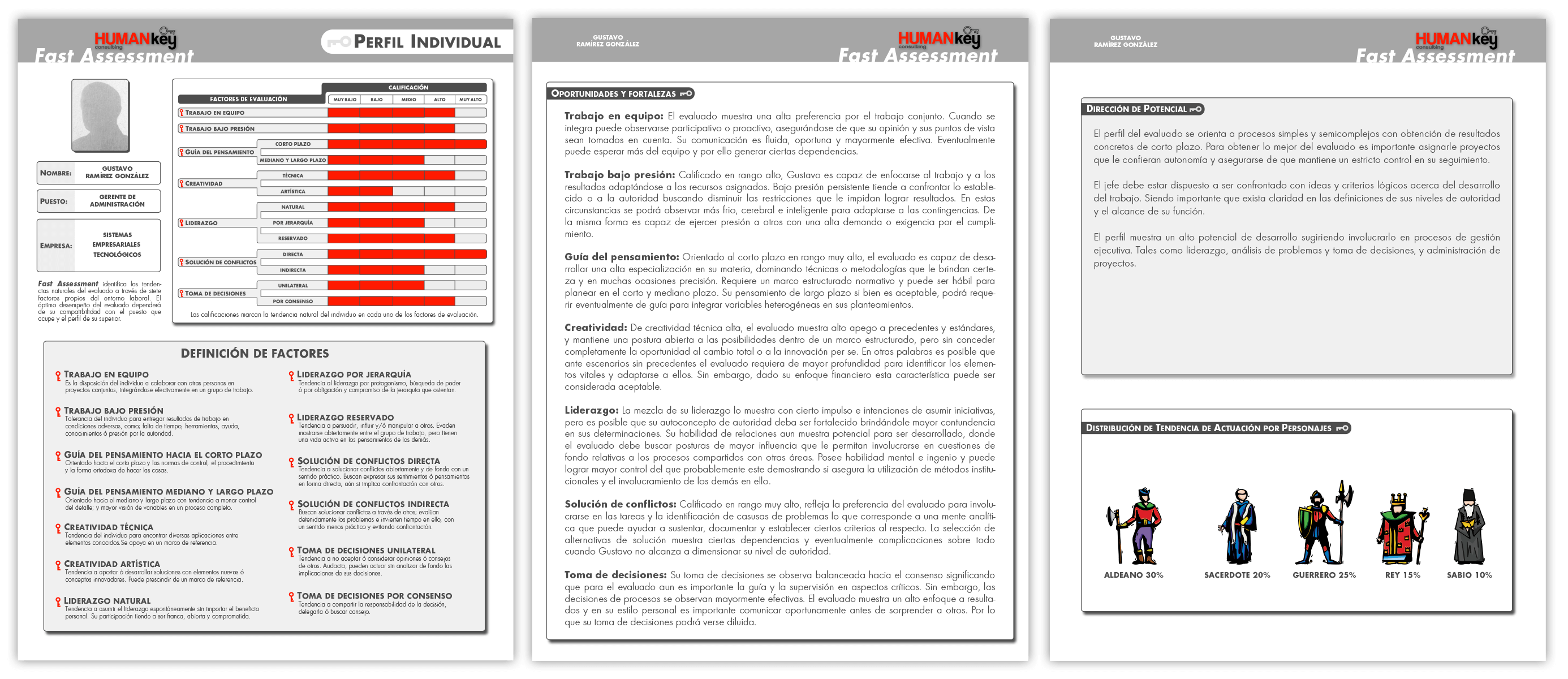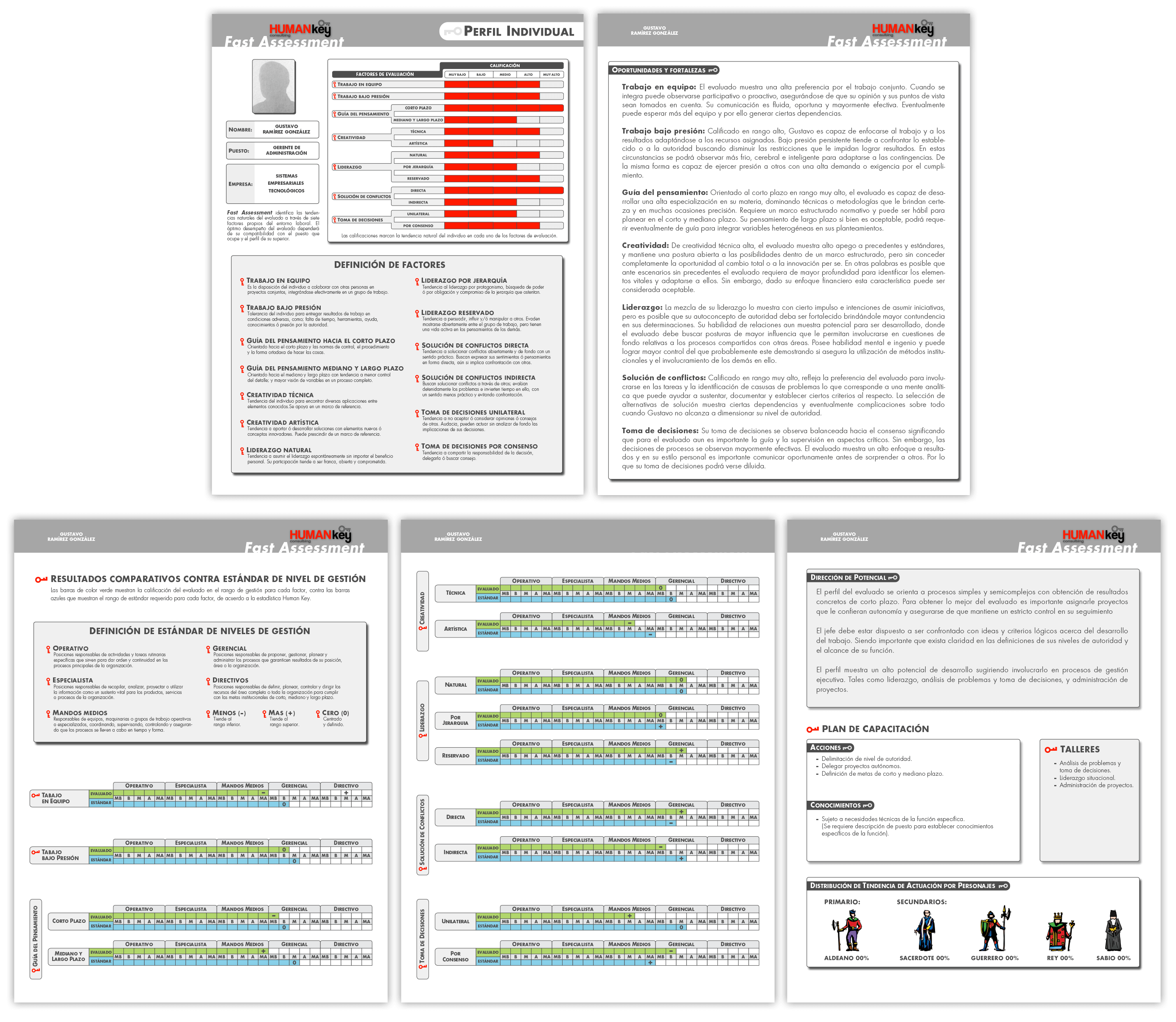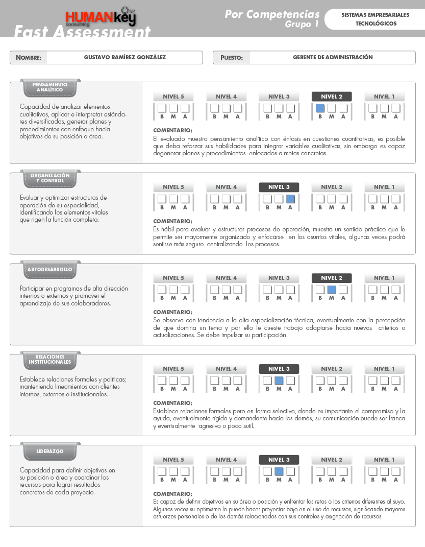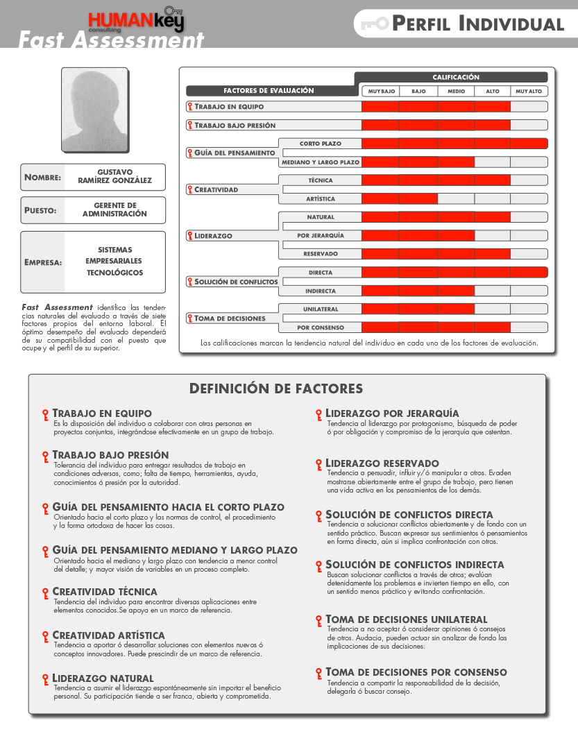 - Cada uno de los 7 factores y subfactores es comparado contra el estándar de la posición a ocupar o que ocupa el evaluado, los estándares son proporcionados por Human Key Consulting, pero pueden ser brindados por el cliente.