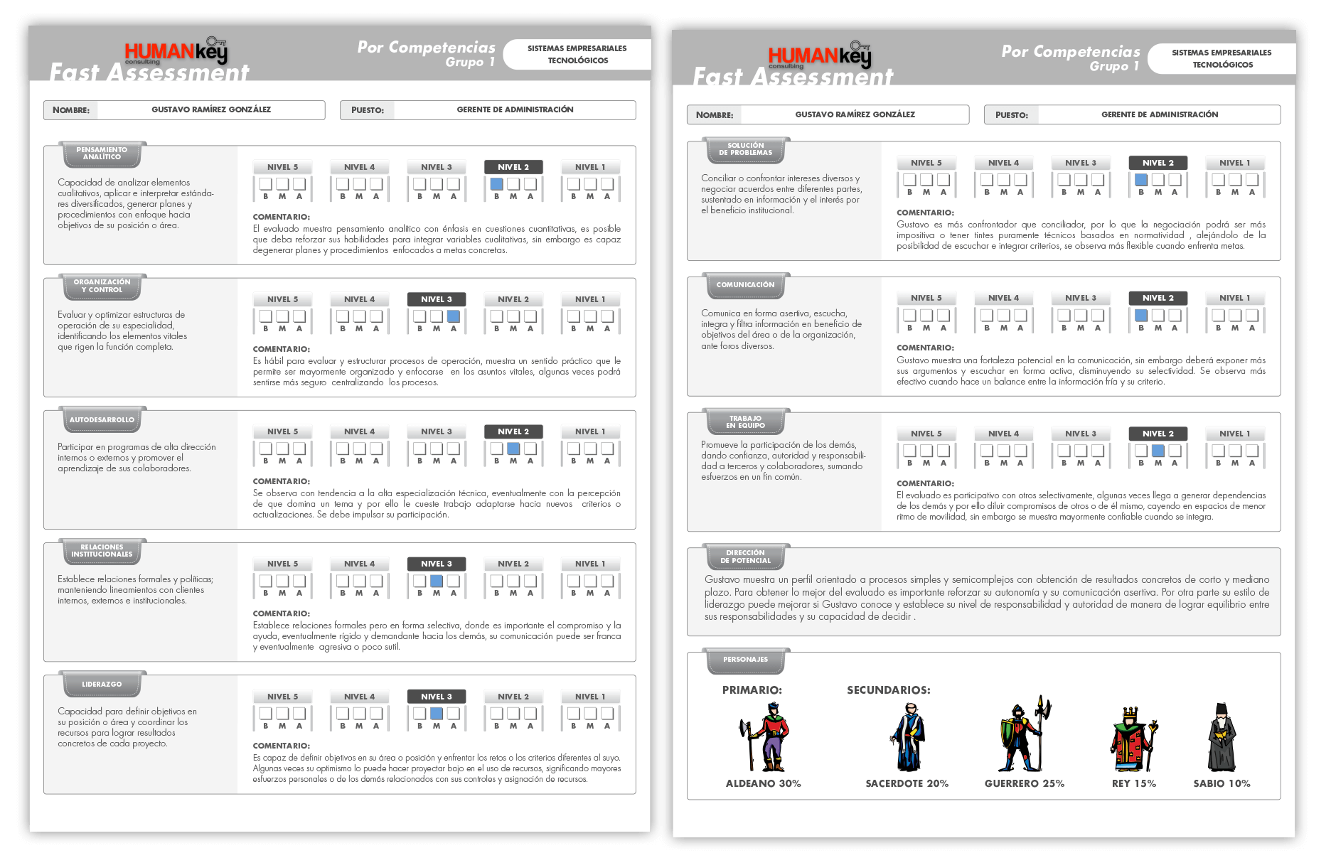 - Se obtiene una síntesis para cada competencia, con un rango de calificación y además la combinación de personajes del evaluado.