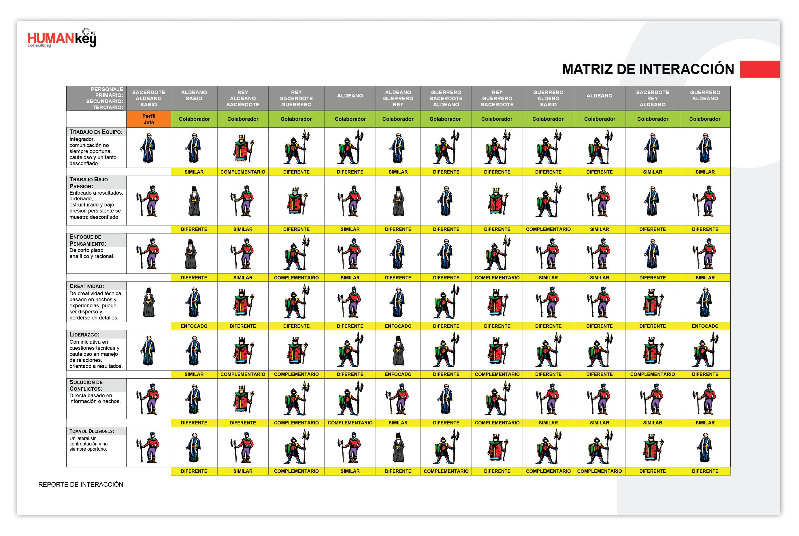 Cada integrante es evaluado con Fast Assessment, obteniendo su tendencia de actuación en cada factor. Dicha tendencia de actuación se representa con un personaje de nuestra metodología: Rey, Sacerdote, Guerrero, Aldeano y Sabio.